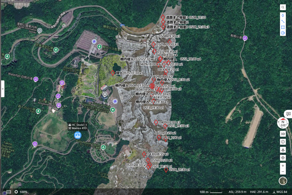 ドローン撮影時に位置情報を記録することで、鹿が確認された地点を時系列で比較することが可能となり、生息エリアや移動経路の整理につながった。