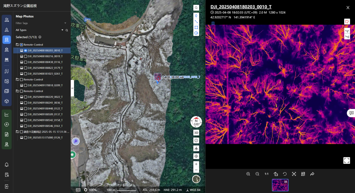 1日に数回の飛行調査が可能であり、サーマルカメラを搭載したドローンで取得した生息エリアの複数のデータは自動的にひとつのデータに構築されるため、調査作業の軽減につながった。
