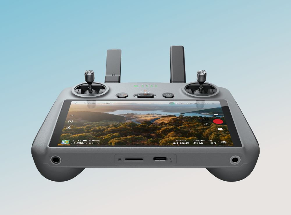 お使いのスマートフォンをモニターとして使用する送信機。専用アプリ「DJI Fly」で操作します。