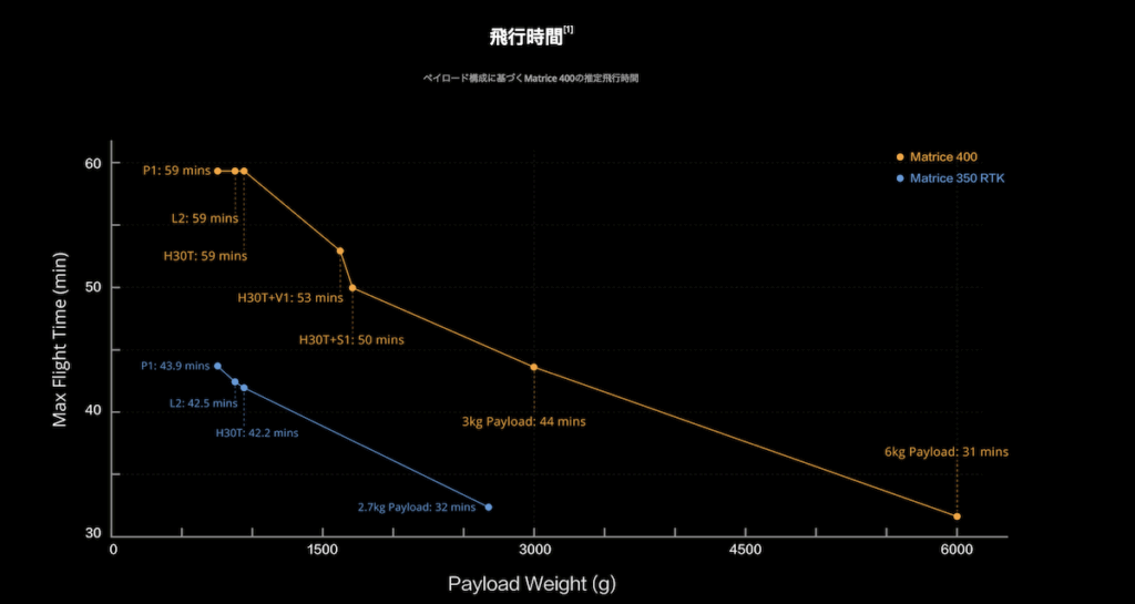 IP55規格で、ペイロードを搭載していても最大飛行時間は、前方飛行時間「最大約59分」ホバリング「最大約53分」。