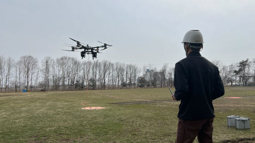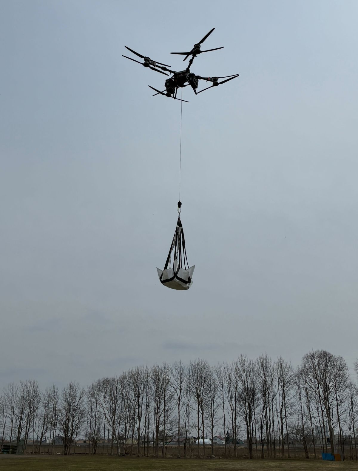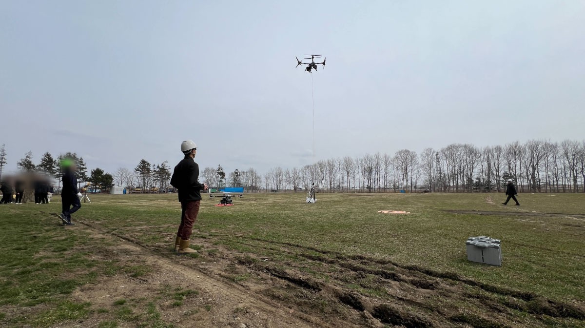 実機によるフライトデモでは、物資の吊り下げ搬送の流れや操作方法、安全面についてご紹介いたしました。